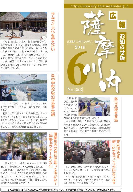 広報薩摩川内 第353号 6月お知らせ版 更新日:2023年03月27日 ダウンロード 令和元年6月25日号No.353全ページ (PDFファイル: 1.6MB) 1ページ 表紙「まちの話題」 (PDFファイル: 536.0KB) 2ページ 情報掲示板 3ページ 情報掲示板 (PDFファイル: 533.7KB) 4ページ 情報掲示板 5ページ 情報掲示板 (PDFファイル: 581.1KB) 6ページ 情報掲示板 7ページ 情報掲示板 (PDFファイル: 791.9KB) 8ページ 7月当番医・夜間救急当番医などのお知らせ (PDFファイル: 564.1KB) この記事に関するお問い合わせ先 未来政策部 秘書広報課 企画総務・広聴広報グループ〒895-8650 神田町3-22電話番号:0996-23-5111 ファックス番号:0996-20-5570メールでのお問い合わせ