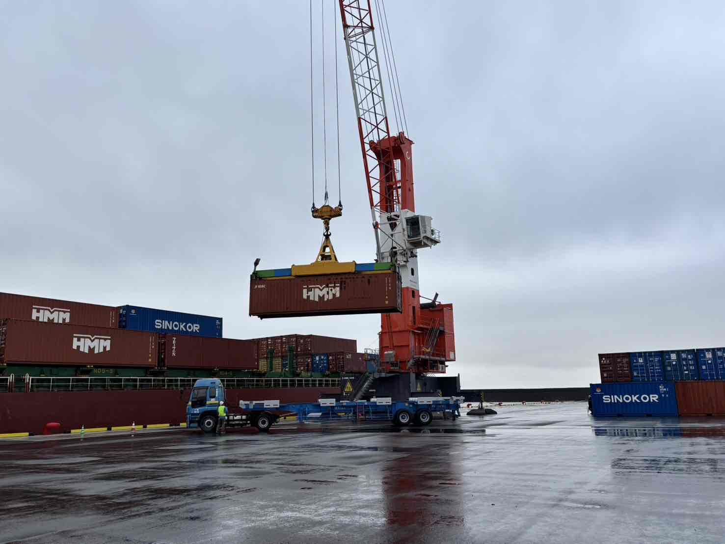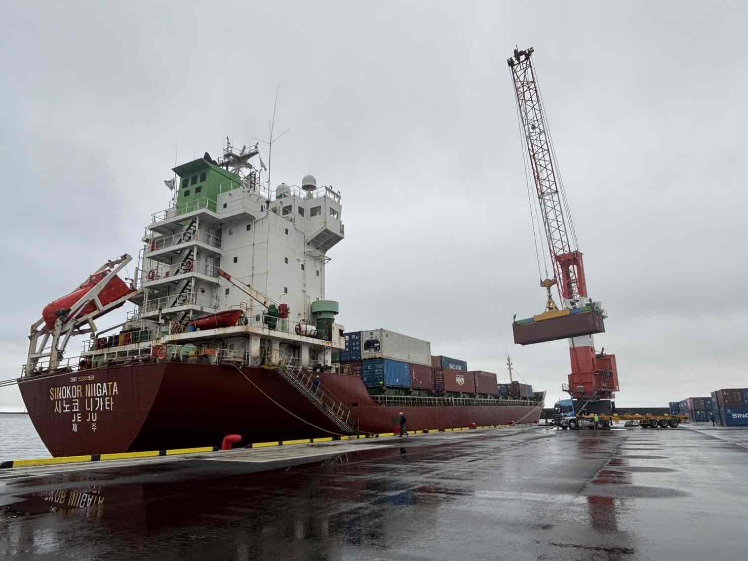 第1便となる貨物は、暫定供用が始まった川内港唐浜埠頭に初めて入港した、興亜ライン株式会社(韓国)のコンテナ船「SINOKOR NIIGATA」により、川内港へ到着しました。