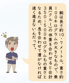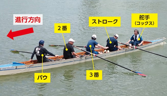 使用する艇(ボート)の種類は舵手(だしゅ)付きナックルフォアというものです。4人の漕ぎ手がそれぞれ長さ約3・8メートルのオールを1本ずつ操って艇を進め、1人が舵手(コックス)として舵を切り、進行方向を決めます。漕ぎ手は進行方向から順に、バウ、2番、3番、ストロークと呼びます。