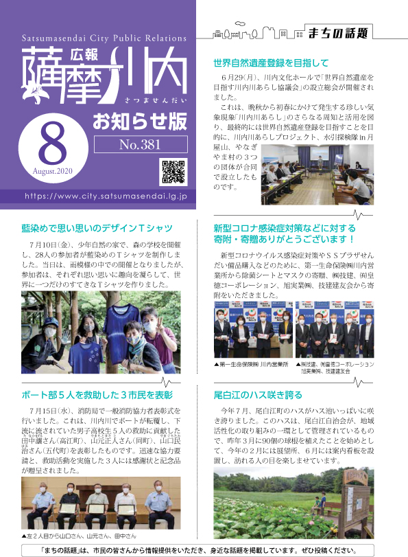 広報薩摩川内 第381号 8月お知らせ版 更新日:2023年03月27日 ダウンロード 令和2年8月25日号No.381全ページ (PDFファイル: 979.6KB) 1ページ 表紙「まちの話題」 (PDFファイル: 376.1KB) 2ページ 情報掲示板 3ページ 情報掲示板 (PDFファイル: 477.1KB) 4ページ 情報掲示板 5ページ 情報掲示板 (PDFファイル: 494.0KB) 6ページ 9月当番医・夜間救急当番医などのお知らせ (PDFファイル: 454.8KB) この記事に関するお問い合わせ先 未来政策部 秘書広報課 企画総務・広聴広報グループ〒895-8650 神田町3-22電話番号:0996-23-5111 ファックス番号:0996-20-5570メールでのお問い合わせ